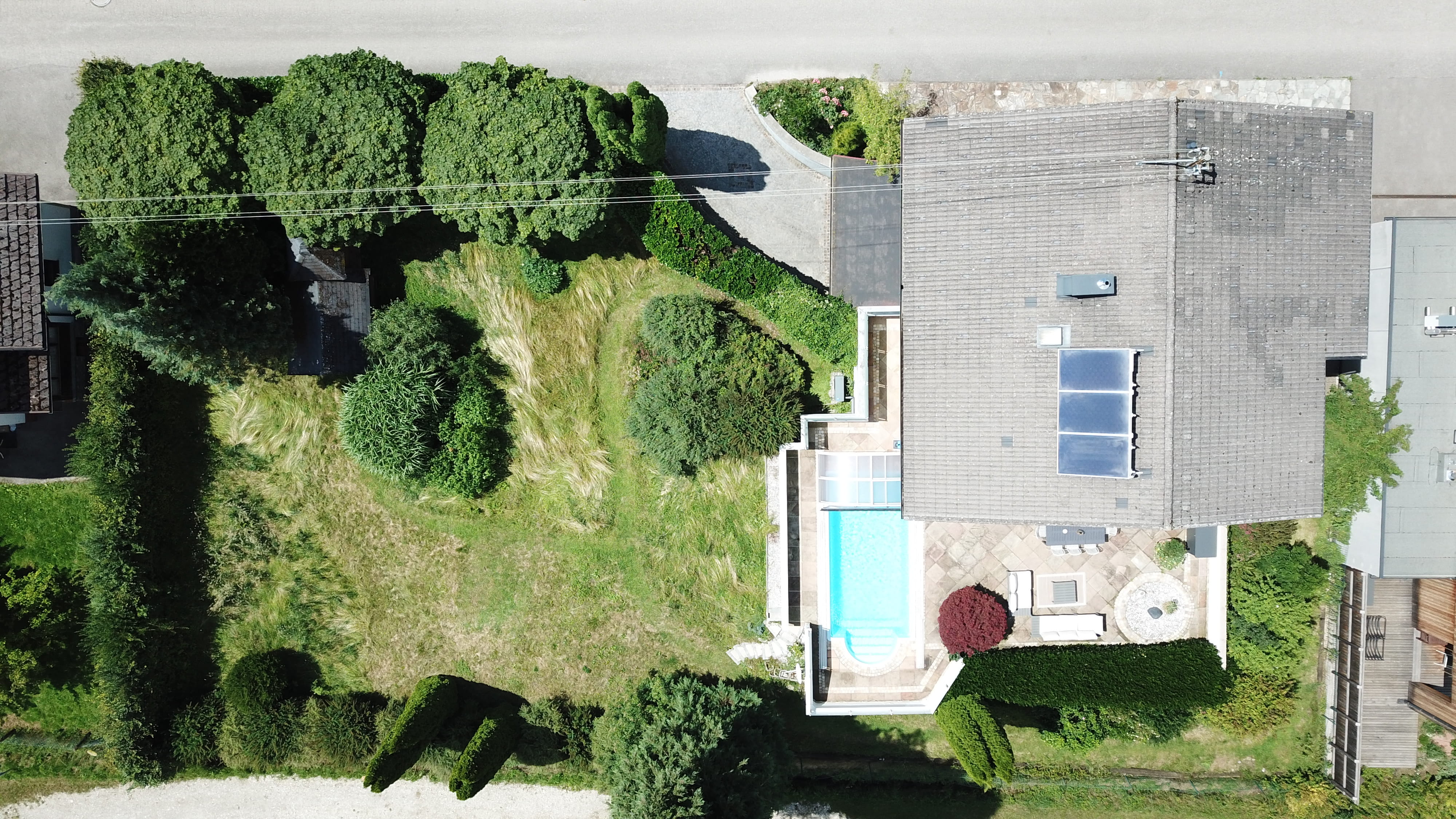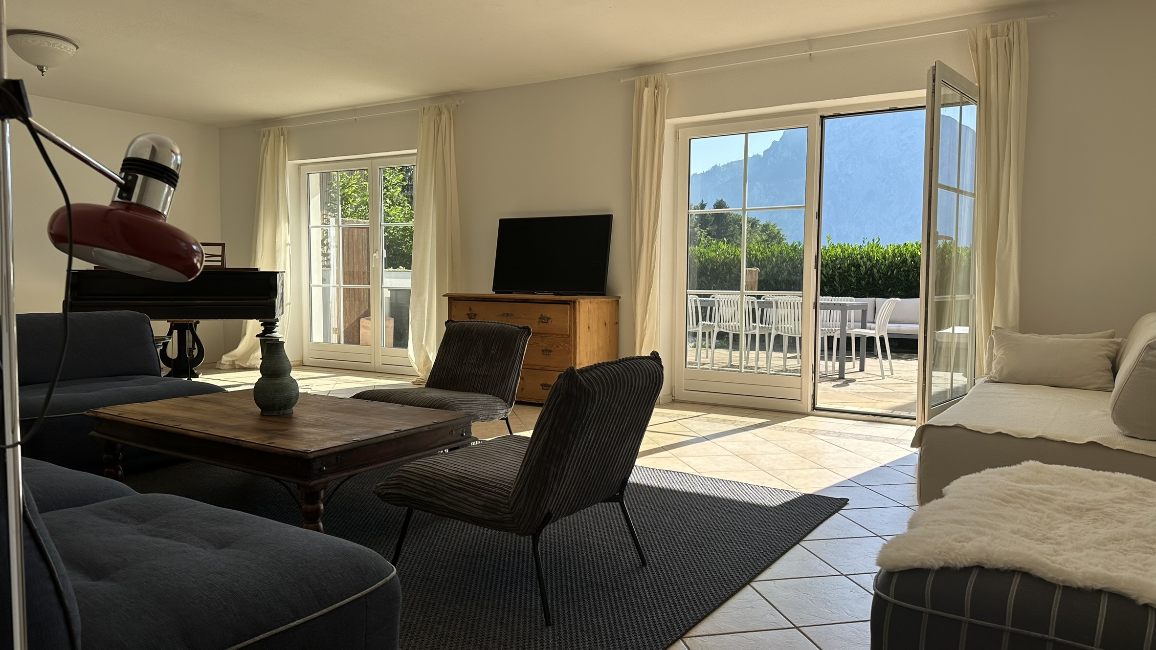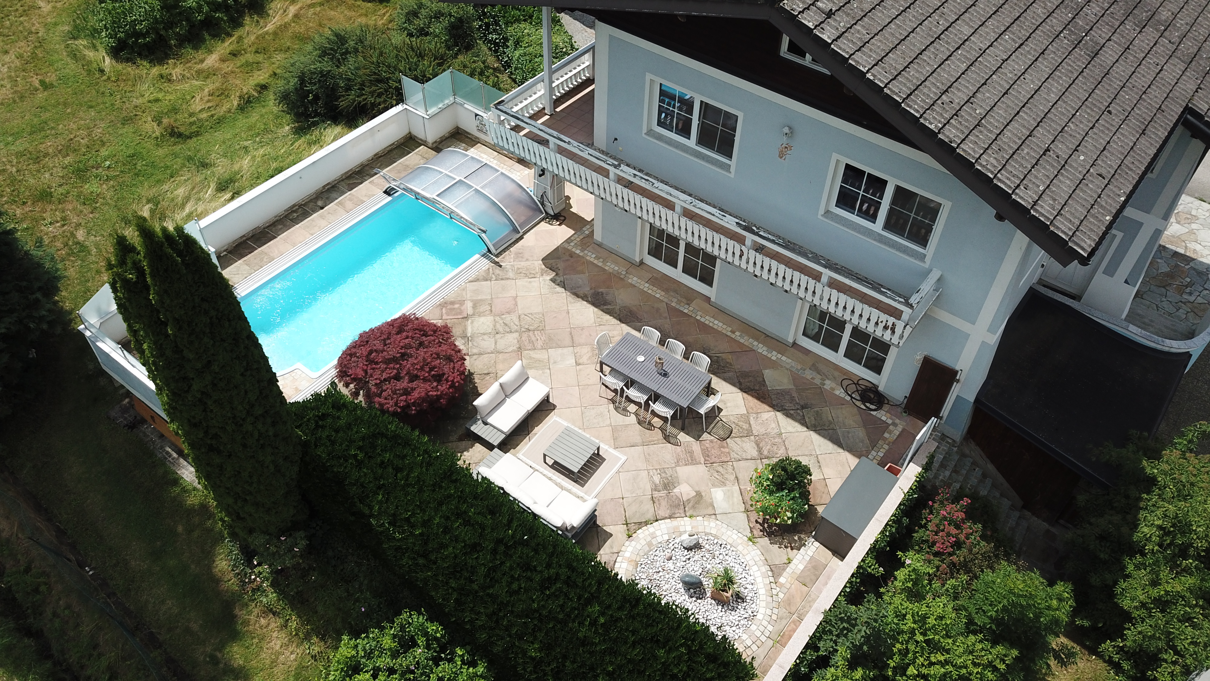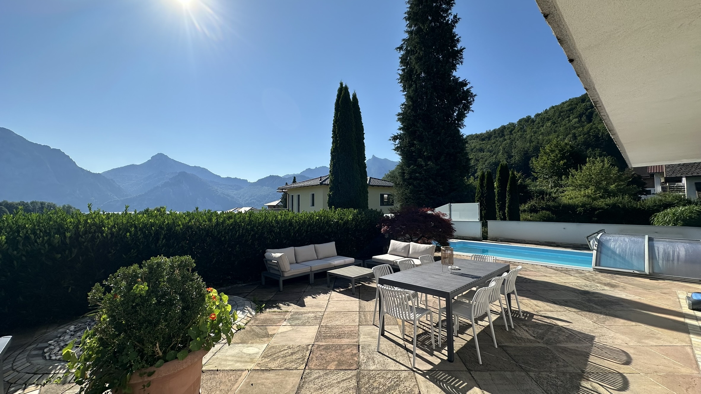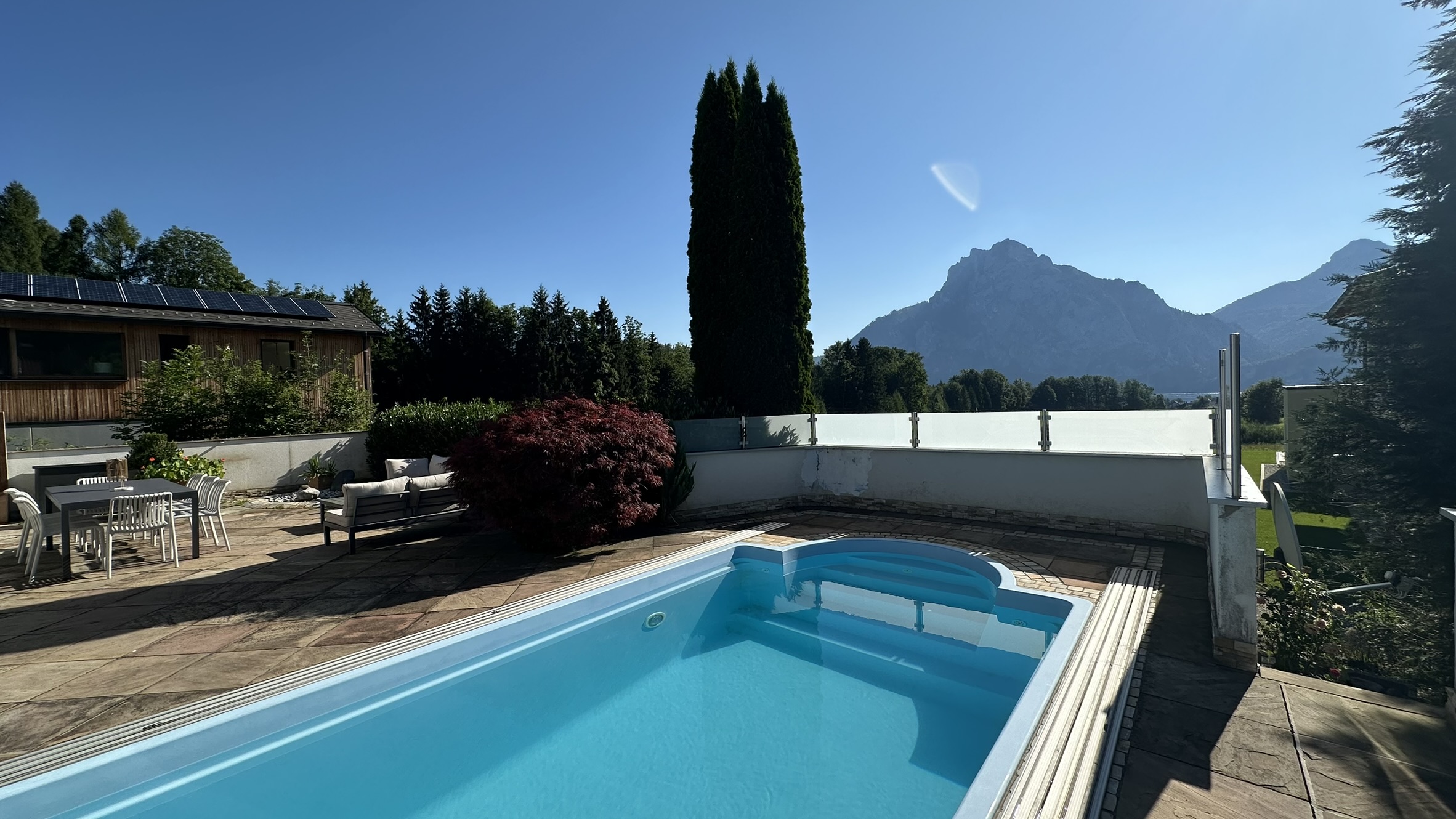 Der Außenbereich umfasst eine große Terrasse mit Esstisch und Loungemöbeln, einen Pool mit Liegen und einen Garten. Von allen Bereichen genießen Sie einen Panoramablick auf Traunstein, die umliegenden Berge und den Traunsee.
