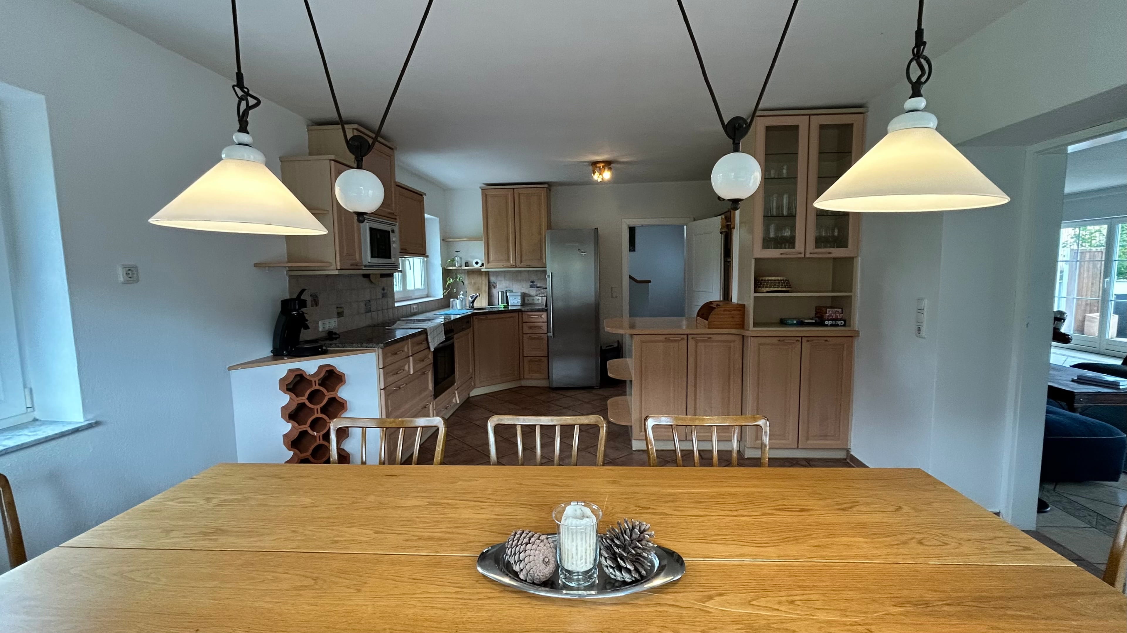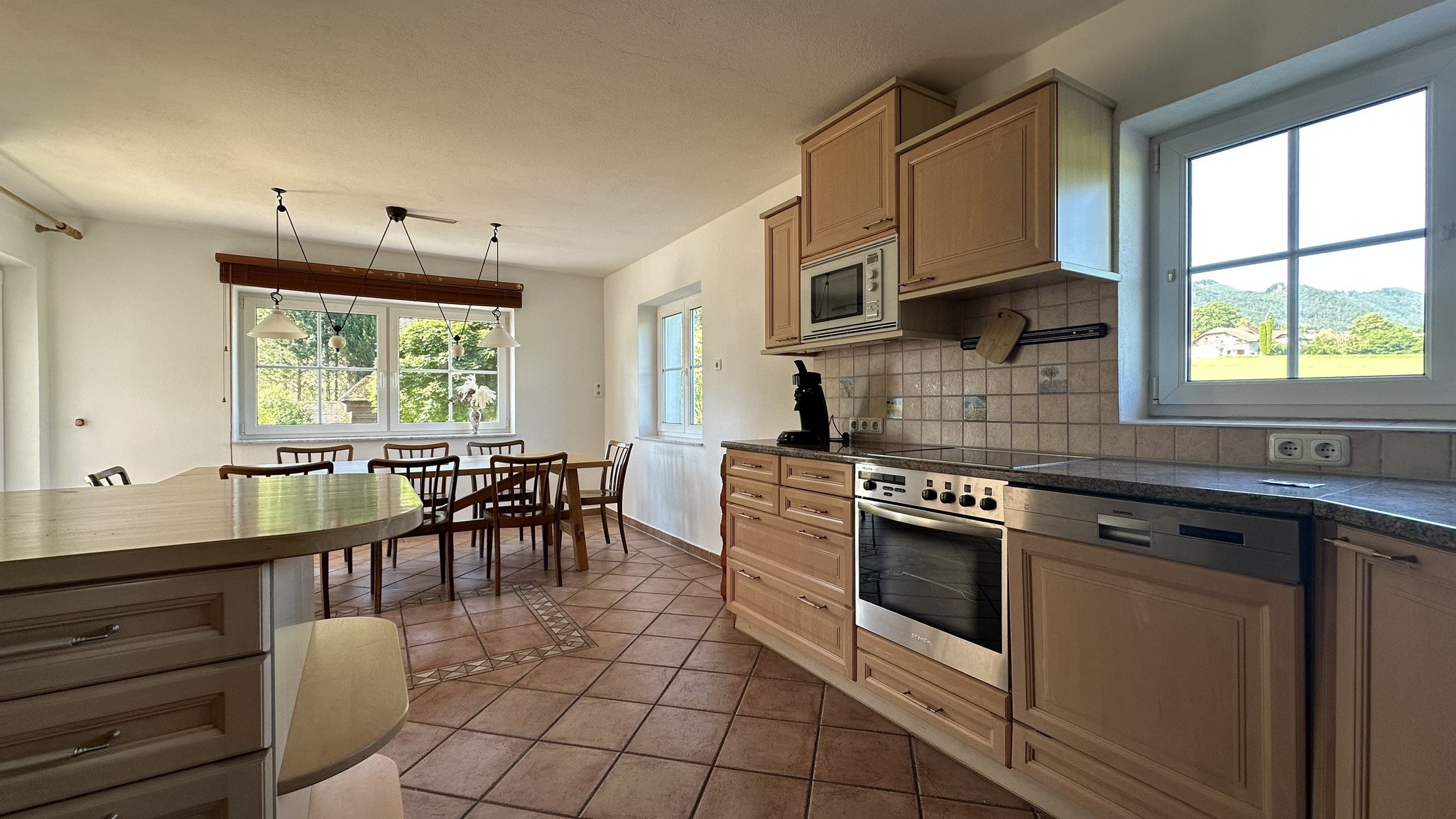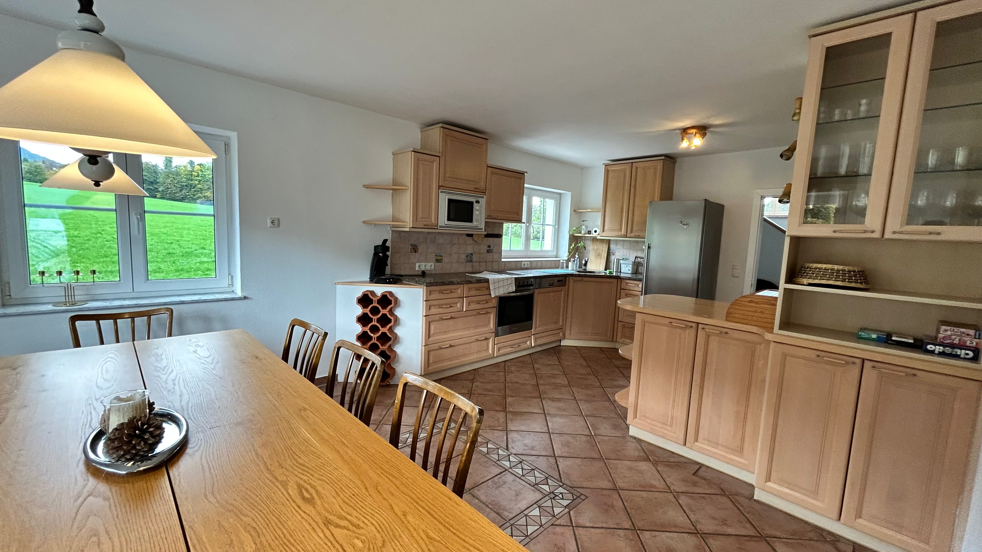 Im Erdgeschoß befindet sich die voll ausgestattete Küche mit großem Esstisch und direktem Zugang auf die Terrasse und in den Garten.