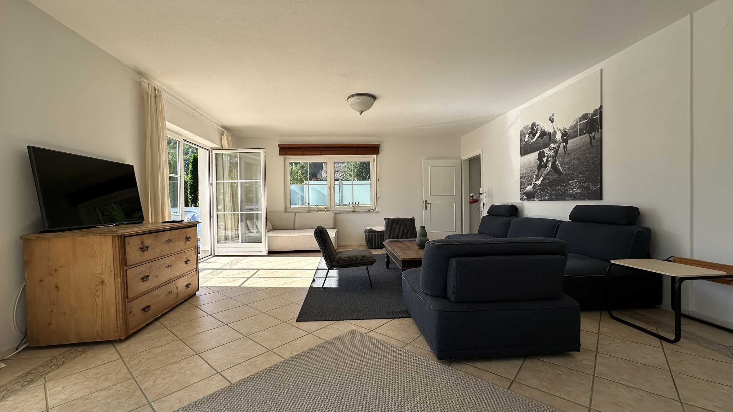 Im Erdgeschoß befindet sich das Wohnzimmer mit Sofalandschaft und Zugang zur Terrasse.